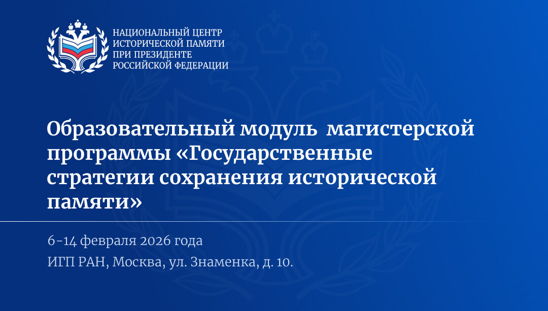 С 6 по 14 февраля 2026 года в Москве будет проходить очный образовательный модуль в рамках совместной магистерской программы Национального центра исторической памяти при Президенте Российской Федерации и Научно-технологического университета «Сириус» по направлению подготовки 46.04.01 (История) «Государственные стратегии сохранения исторической памяти».