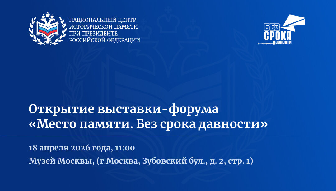 18 апреля 2026 года в 11:00 в Музее Москвы (Зубовский бул., д. 2, стр. 1) состоится открытие выставки-форума «Место памяти. Без срока давности» – уникального мультимедийного выставочного пространства, в рамках которого масштабно и эмоционально раскрывается тема геноцида советского народа нацистами и их пособниками в годы Великой Отечественной войны.