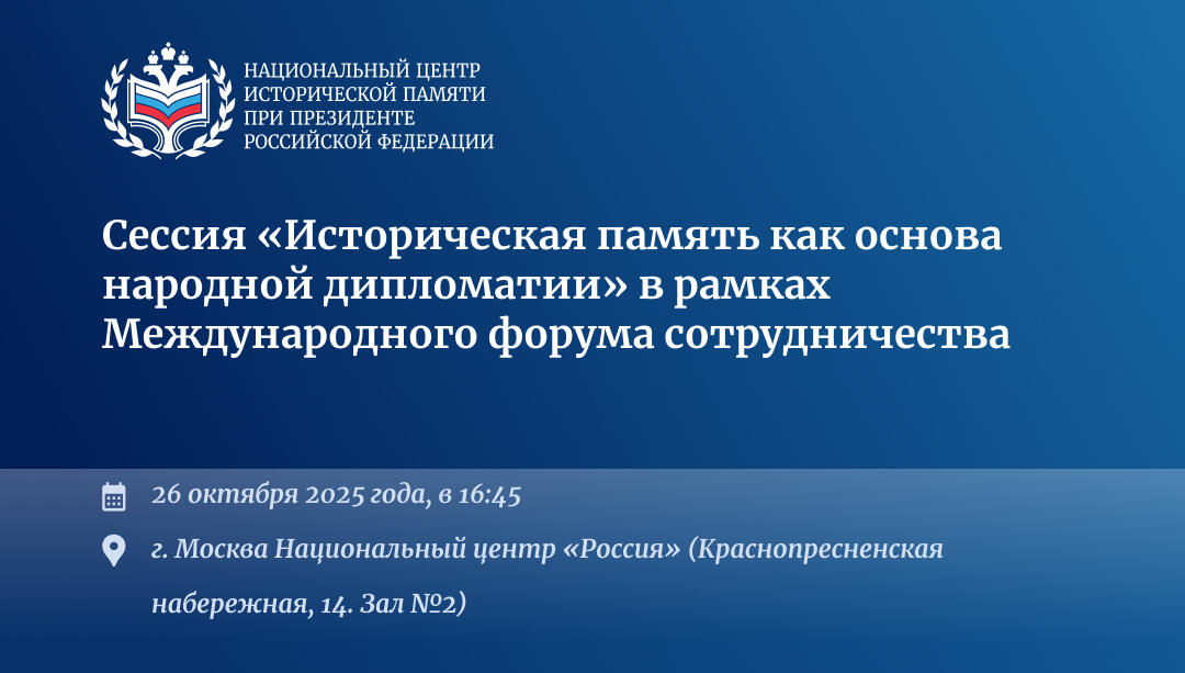 В рамках Международного форума сотрудничества Национальный центр исторической памяти при Президенте Российской Федерации проведет сессию «Историческая память как основа народной дипломатии». Модератором сессии выступит руководитель Национального центра, член Общественной палаты РФ Елена Малышева.