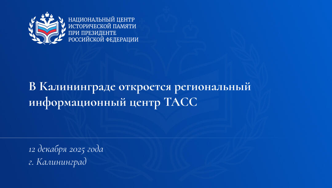 В рамках рабочей поездки в Калининград 12 декабря руководитель Национального центра исторической памяти при Президенте Российской Федерации, член Общественной палаты РФ Елена Малышева примет участие в официальной церемонии открытия Регионального информационного центра (РИЦ) «ТАСС Калининград».