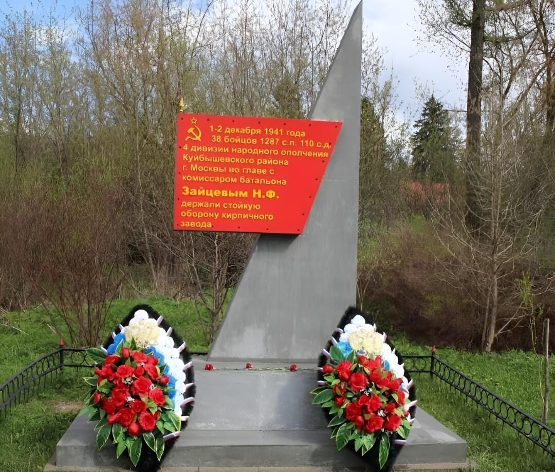Памятный знак, установлен в честь Никиты Филипповича Зайцева и 38 его бойцов, сражавшихся у кирпичного завода близ деревни Горчухино. В годы войны, на левом фланге 33-й армии, в районе деревень Горчухино, Атепцево, Слизнево и Каменское, разгорелись ожесточенные бои. Воины, среди которых были и москвичи, проявили невероятную стойкость, не позволяя врагу приблизиться к столице. На небольшом участке обороны, в районе бывшего кирпичного завода, 38 бойцов заняли свои позиции в блиндажах и поклялись защищать их до последнего. Комиссар Зайцев и его бойцы стойко держали оборону до тех пор, пока не подошли советские войска. К концу 2 декабря подразделения 1-й гвардейской Московской мотострелковой дивизии смогли оттеснить немецкие войска за реку Нару, обеспечив тем самым временное спокойствие и безопасность для жителей окрестных деревень. Этот подвиг стал символом мужества и самоотверженности, которые проявили наши солдаты в самые тяжелые дни войны.