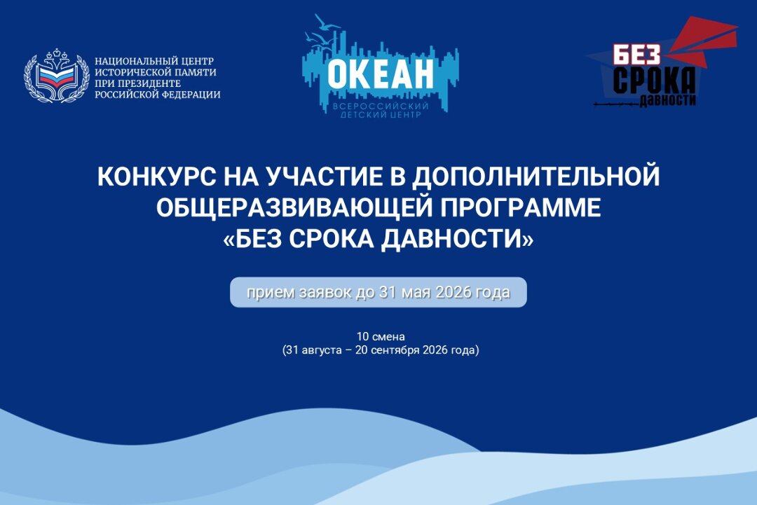 Национальный центр исторической памяти при Президенте Российской Федерации объявляет Конкурс на участие в дополнительной общеразвивающей программе «Без срока давности», реализуемой совместно с ВДЦ «Океан», открытым.