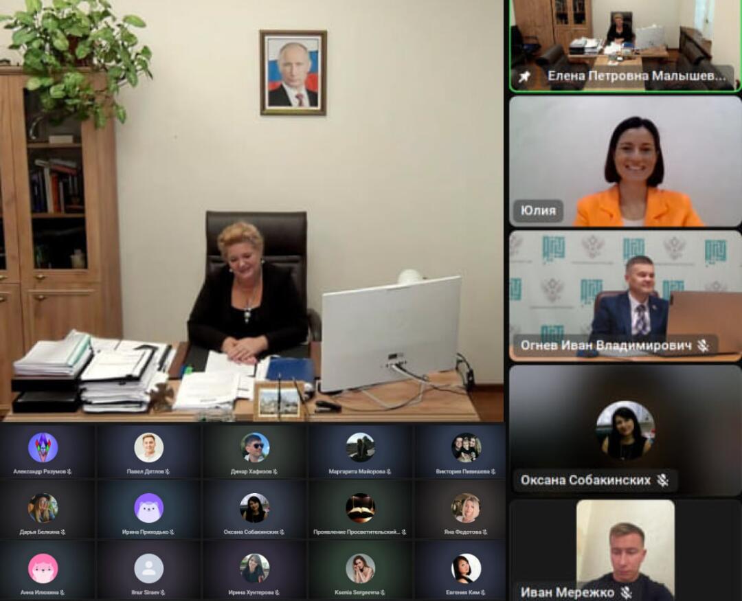 В рамках программы наставничества Всероссийского конкурса «Знание.Лектор» в номинации «История и политика» руководитель Национального центра исторической памяти при Президенте Российской Федерации, член Общественной палаты РФ Елена Малышева провела мотивационную встречу с конкурсантами.