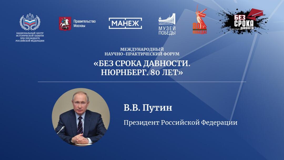 Президент Российской Федерации обратился к участникам Международного научно-практического форума «Без срока давности. Нюрнберг. 80 лет», который Национальный центр исторической памяти при президенте Российской Федерации совместно с партнерскими организациями проводит 20-21 ноября в Центральном выставочном зале «Манеж» и Музее Победы.