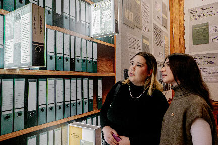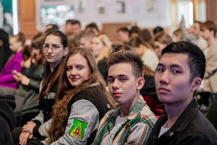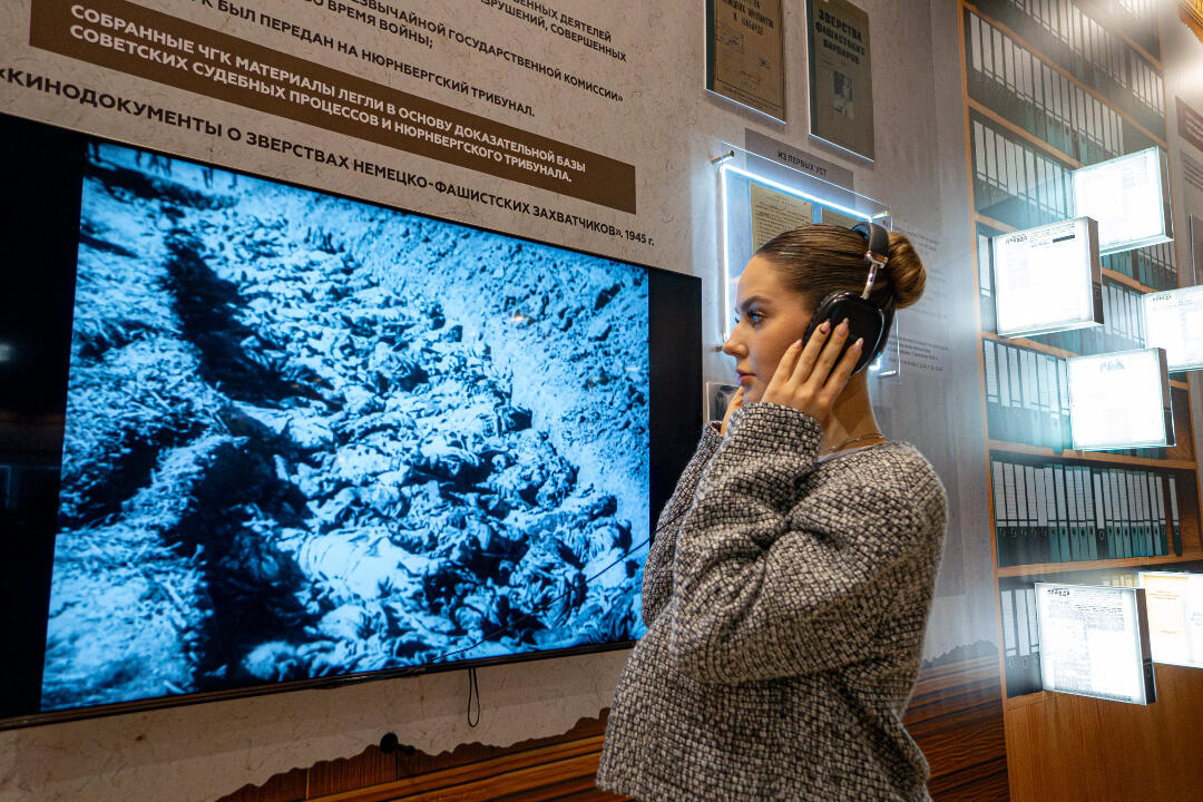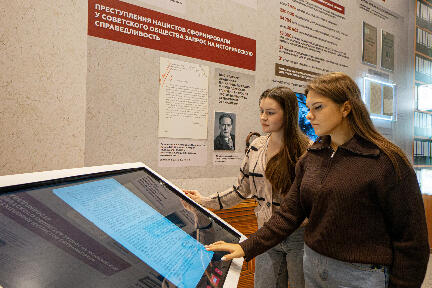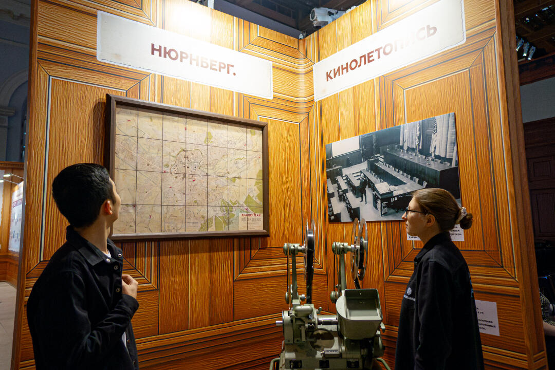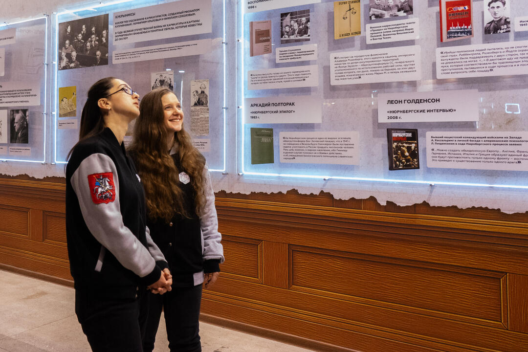 Молодые люди познакомились с экспозицией Национального центра, развернутой в Манеже и посвященной 80-летию со дня начала Нюрнбергского процесса.