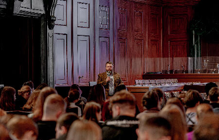 Представители молодежных палат в рамках проекта Центра молодежного парламентаризма города Москвы «Zдесь и сейчас» собрались в Центральном выставочном зале «Манеж» – в частично воссозданном по инициативе Национального центра исторической памяти при Президенте Российской Федерации интерьере зала № 600 Дворца правосудия в Нюрнберге.