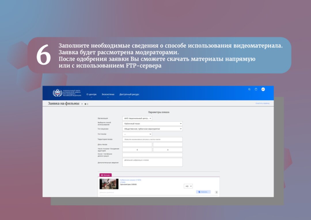 Используйте материалы платформы для реализации просветительских и социальных проектов. Подайте заявку на доступ к контенту, указав цель использования. После рассмотрения заявки Вам будет предоставлен свободный безвозмездный доступ. Просим Вас в течении 6 месяцев предоставить отчет об использовании материалов медиаплатформы.